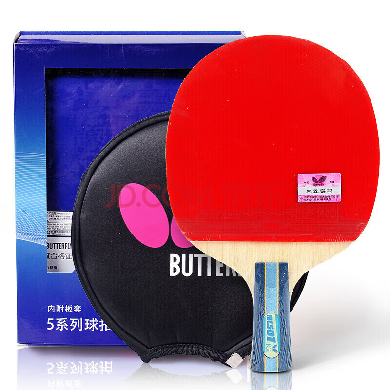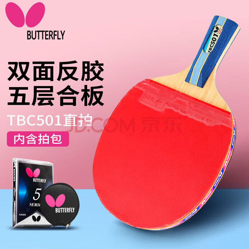 商品相册:蝴蝶五星级乒乓球拍直拍双面反胶皮比赛底板TBC501单拍含拍包第