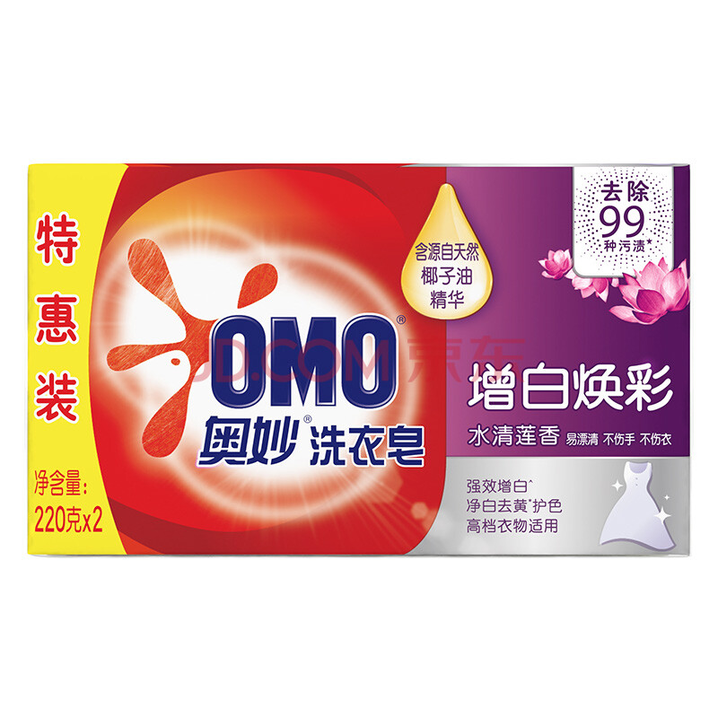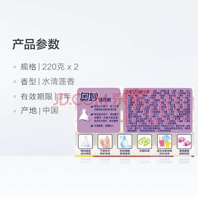 商品相册:奥妙强效增白香皂 肥皂 洗衣皂 水清莲香220g*2(新老包装随机发货)第