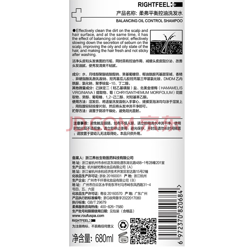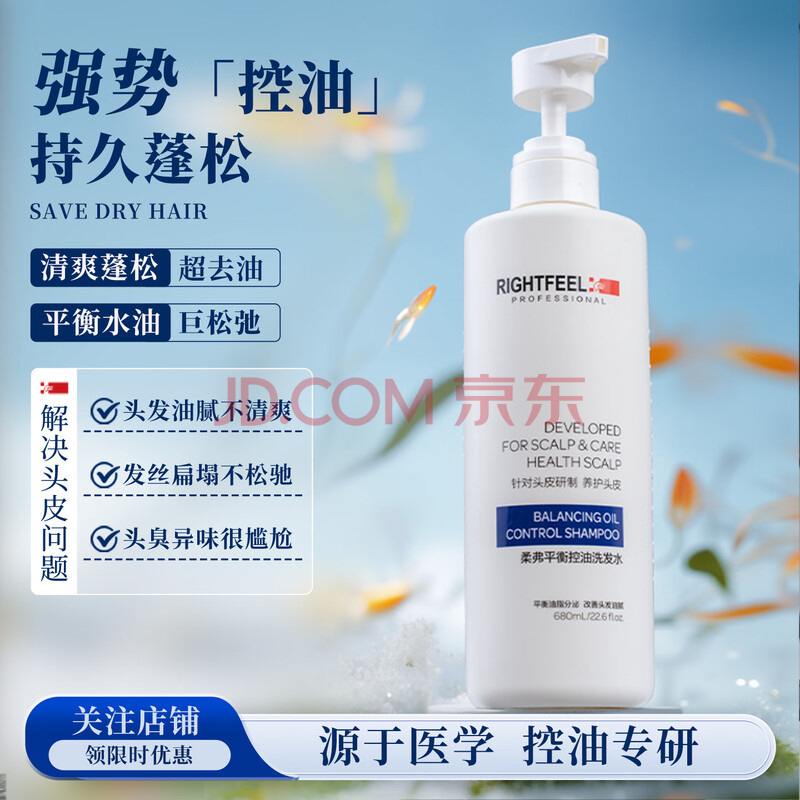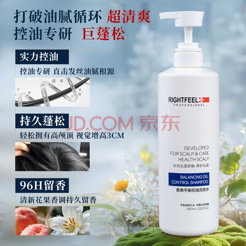 商品相册:柔弗(RIGHTFEEL)平衡控油洗发水680ml无硅油持久去油清爽蓬松植物清香洗发露第
