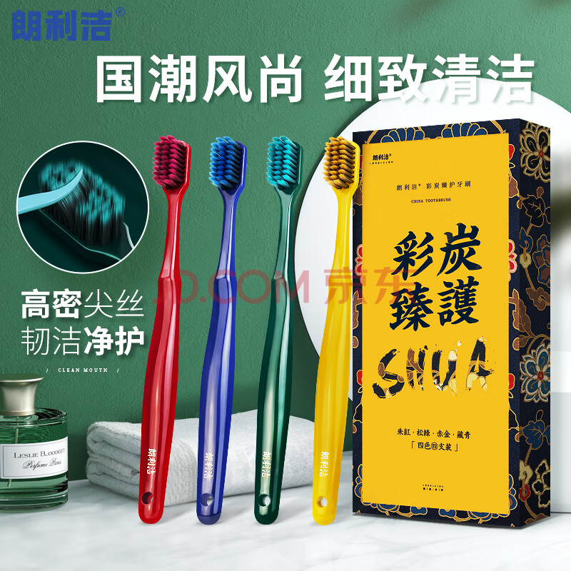 商品相册:朗利洁彩炭臻护成人宽头软毛牙刷高密尖丝独立刷帽国风碳丝刷毛4支装第