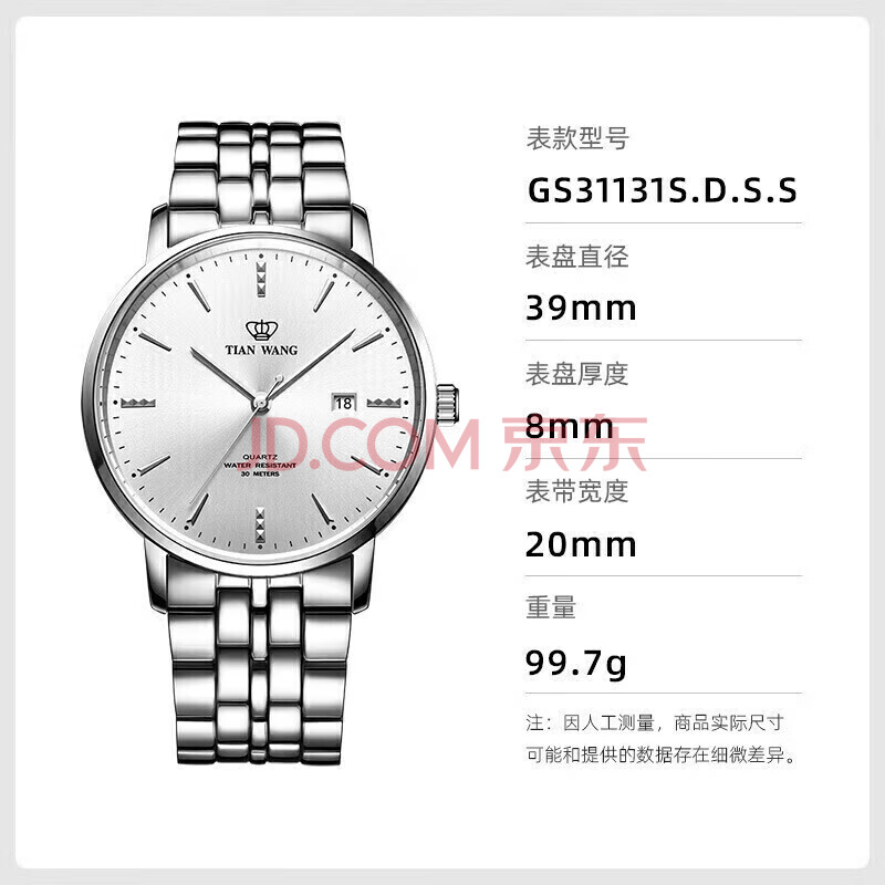 商品相册:天王(TIAN WANG)手表男士 生日礼物学生手表钢带石英男表白色GS31131S.D.S.S第