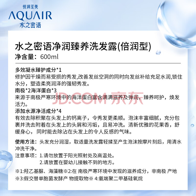 商品相册:水之密语(AQUAIR)净润臻养(倍润型)洗发水600ml滋养保湿男女士洗发露京东自营热销第