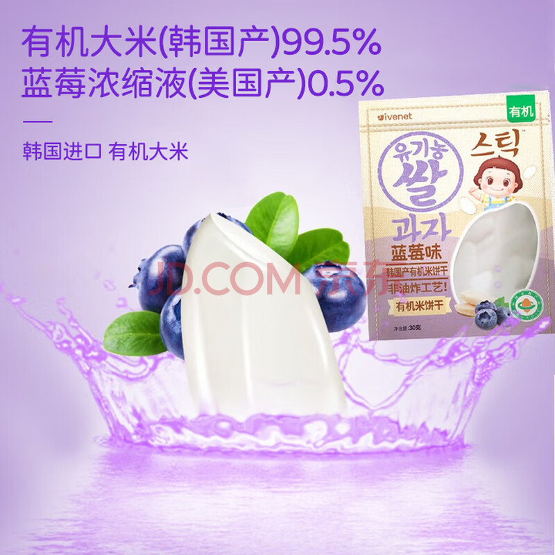 商品相册:艾唯倪(ivenet)有机米饼 宝宝儿童零食磨牙韩国原装进口无额外添加盐糖蓝莓味30g第