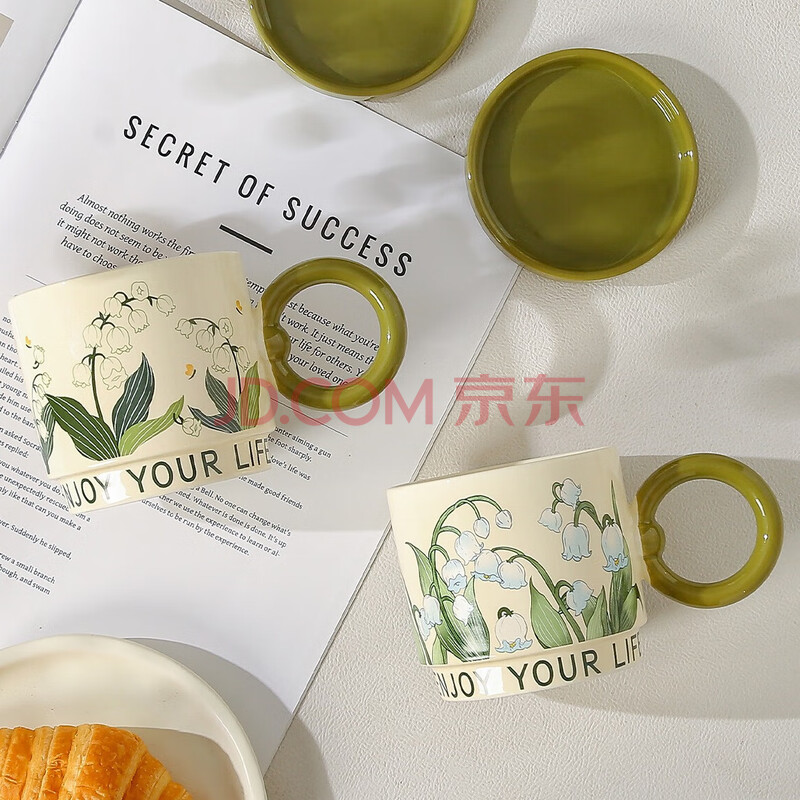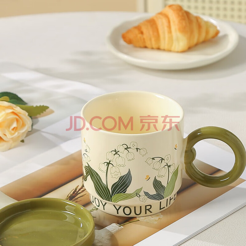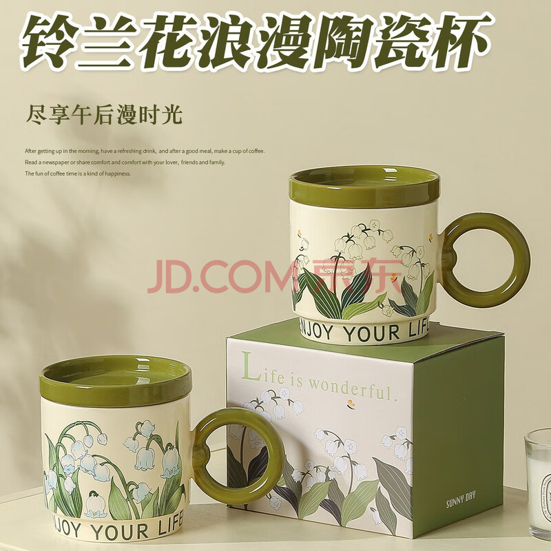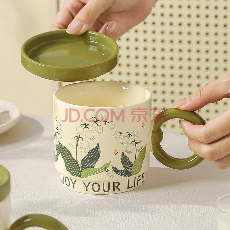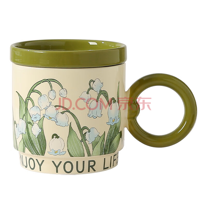 商品相册:传旗陶瓷马克杯带盖咖啡杯牛奶杯早餐杯子办公杯男女茶杯 铃兰花400ml第