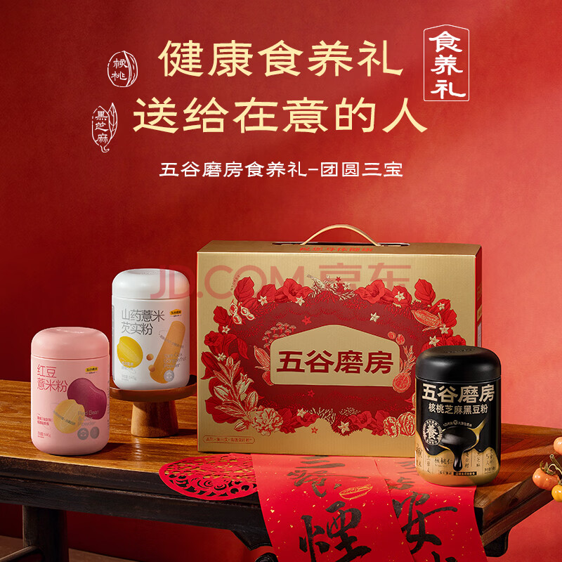 商品相册:五谷磨房团圆三宝礼盒低GI黑芝麻糊养胃山药粉食养送父母送长辈礼品1638g第