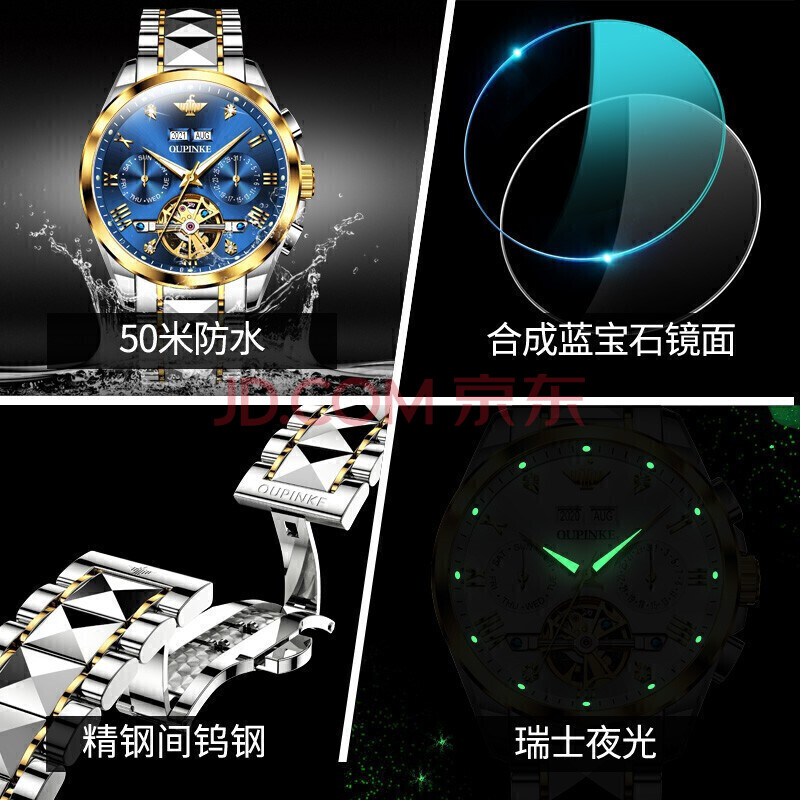 商品相册:欧品客手表男士机械全自动飞轮夜光防水瑞士认证品牌名表男礼物京东自营第