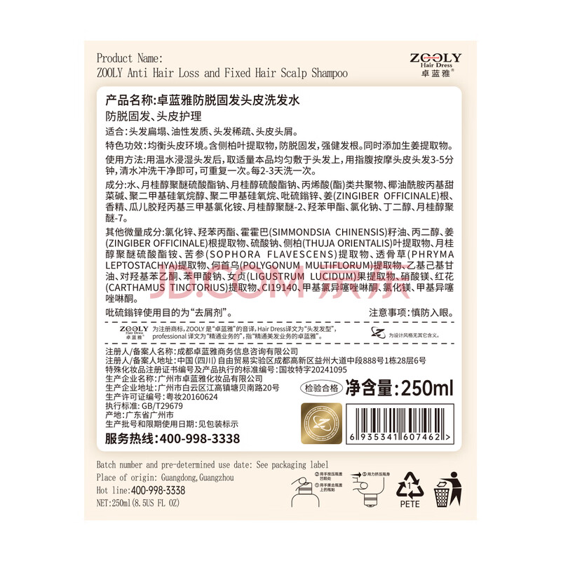 商品相册:卓蓝雅生姜防脱固发洗发水250ml(洗头膏 洗发露 防脱固发 男女通用)第