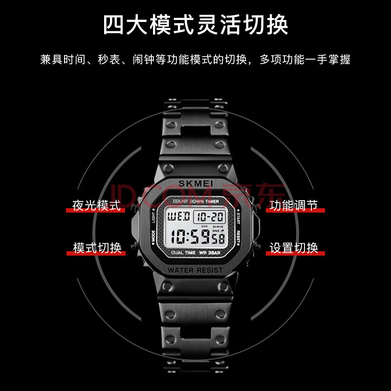 商品相册:时刻美(skmei)学生时尚潮流运动电子手表初高中生青少年小方表防水钢带腕表1433第