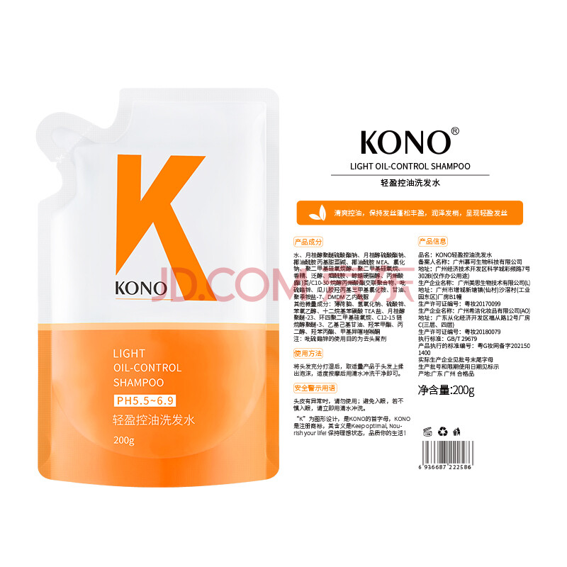 商品相册:KONO卡厘轻盈控油洗发水(补充装)200g第1张/共3
