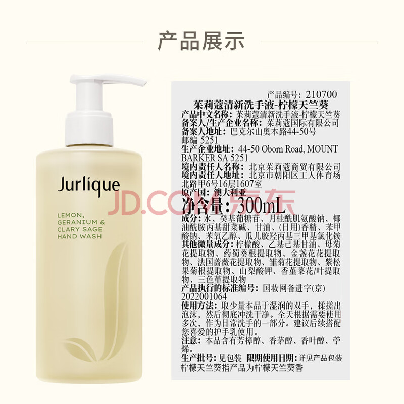 商品相册:茱莉蔻(Jurlique)柠檬天竺葵清新洗手液300ML 滋润保湿柔嫩肌肤温和 生日礼物第