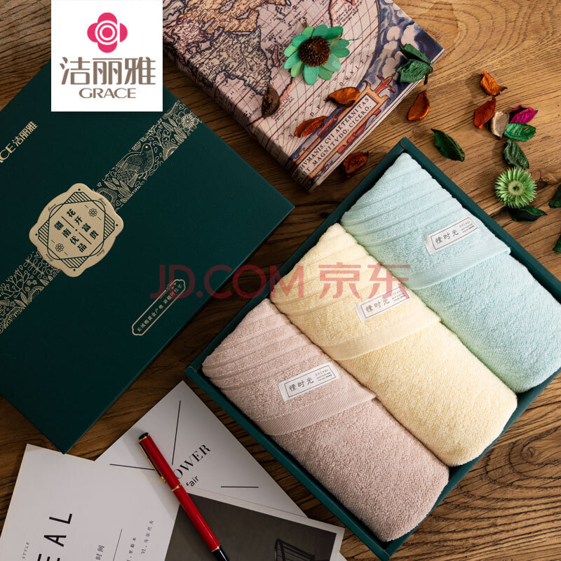 商品相册:洁丽雅(Grace)新疆棉毛巾柔软纯棉吸水洗脸家用 W1169愫时光三条礼盒装 夜幕绿礼盒 粉色+黄色+棕色第