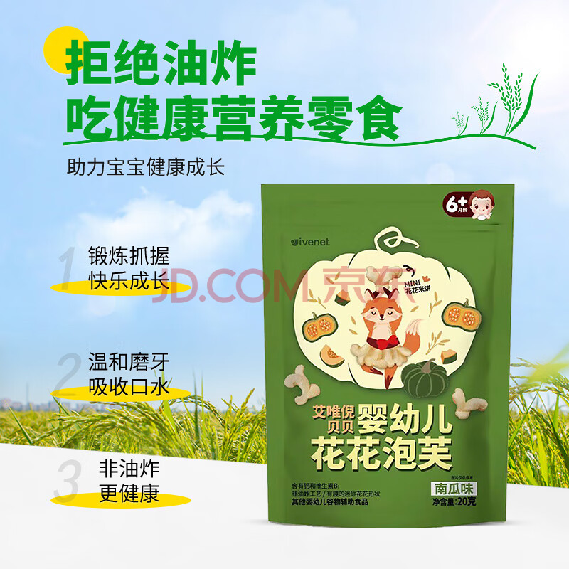 商品相册:艾唯倪(ivenet)婴幼儿花花泡芙辅食磨牙饼干宝宝零食6个月以上婴儿零食南瓜味20g第