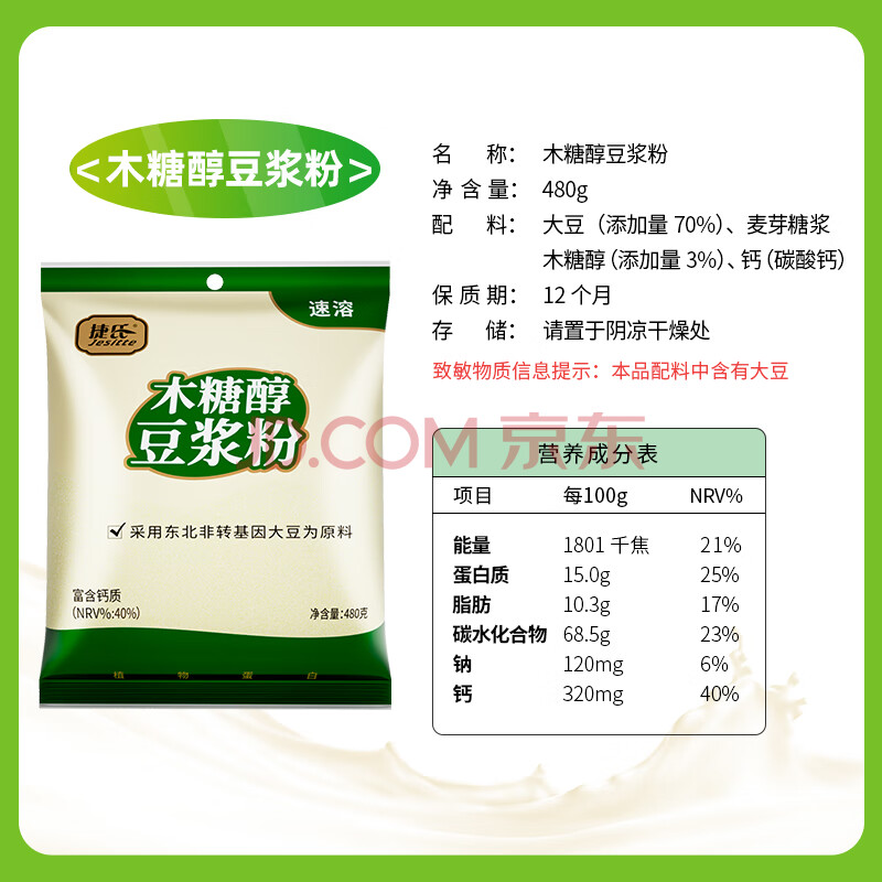 商品相册:捷氏木糖醇豆浆粉480g无蔗糖添加高蛋白质健身代餐 孕妇营养谷物早餐第