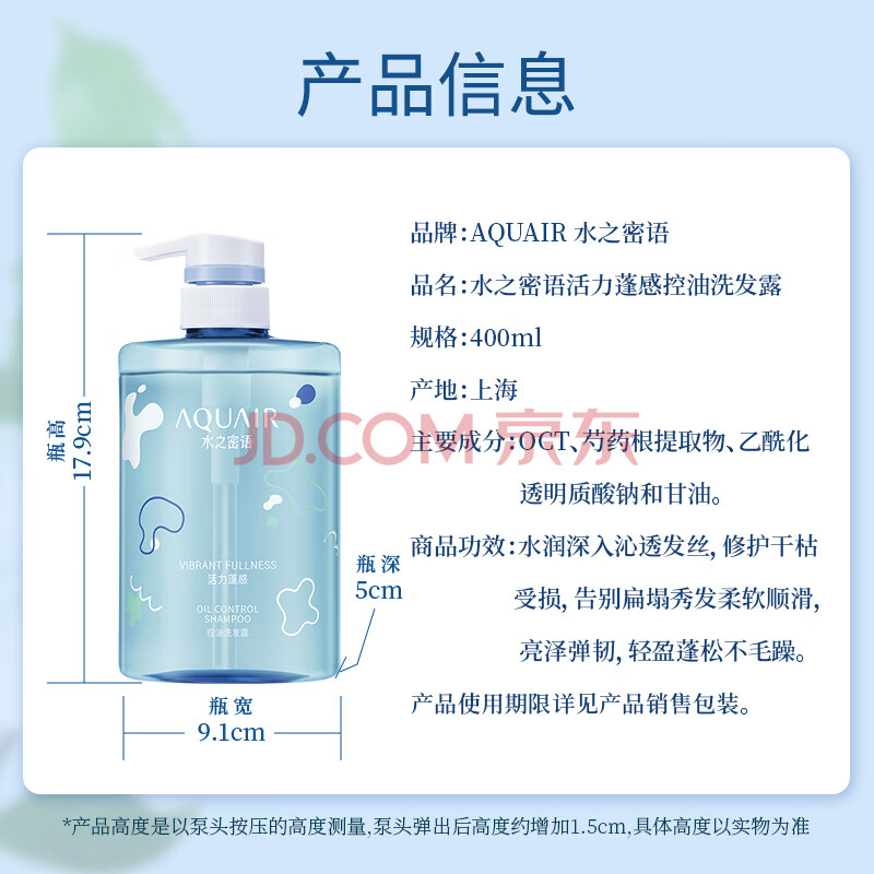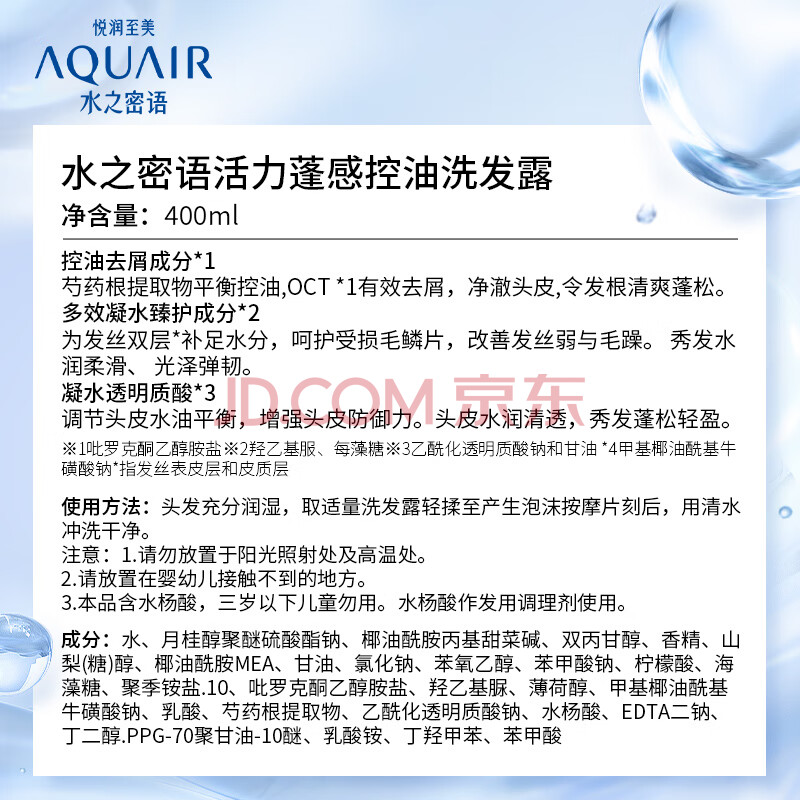 商品相册:水之密语(AQUAIR)活力蓬感洗发水400ml男女控油去屑洗头膏蓬松柔顺洗发露第