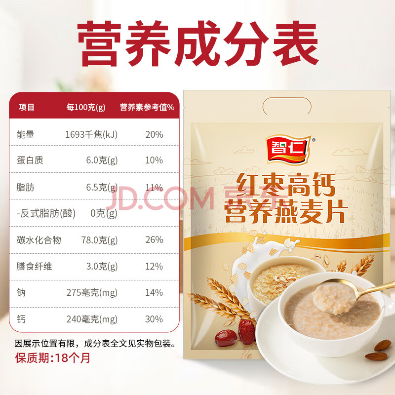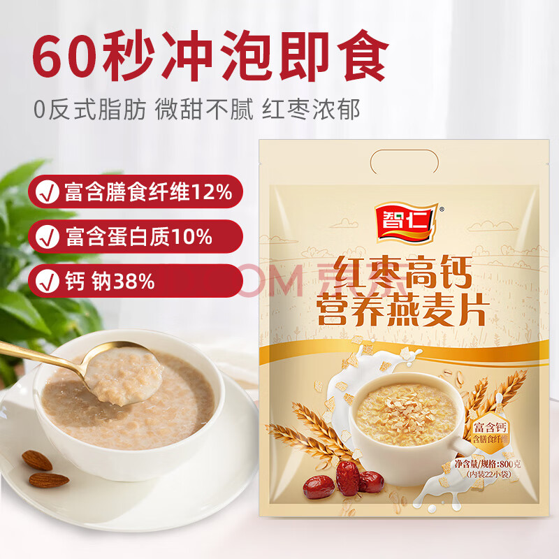 商品相册:智仁 红枣高钙营养燕麦片 独立小袋包装 800g 醇香粗粮即食 冲饮谷物第