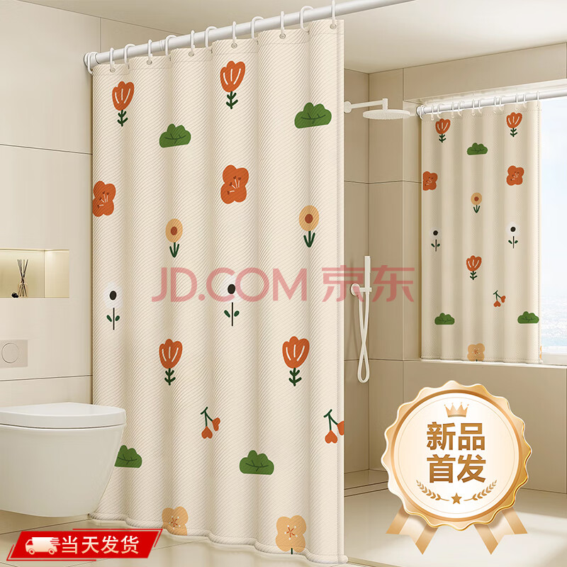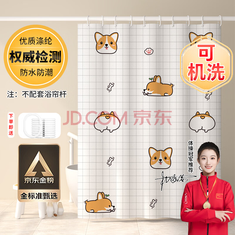商品相册:访客 浴帘 优质涤纶加厚免打孔浴室防水隔断帘 柯基款1.8-2米带挂环第