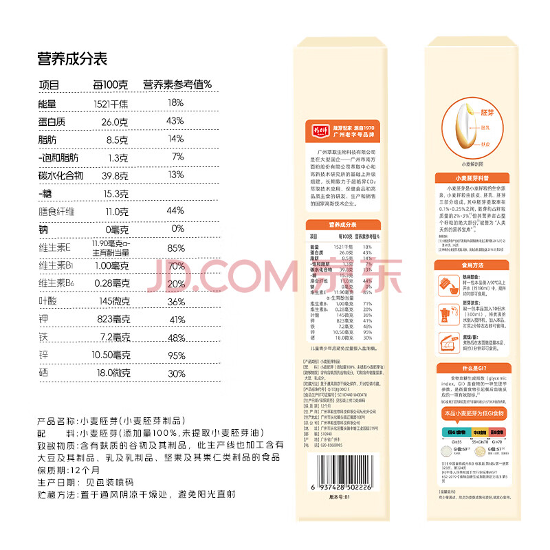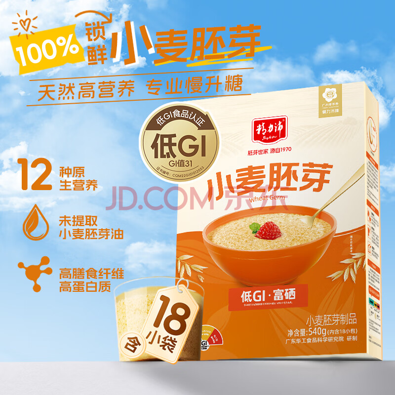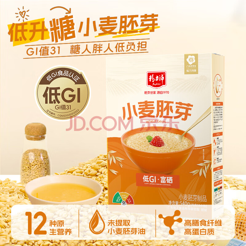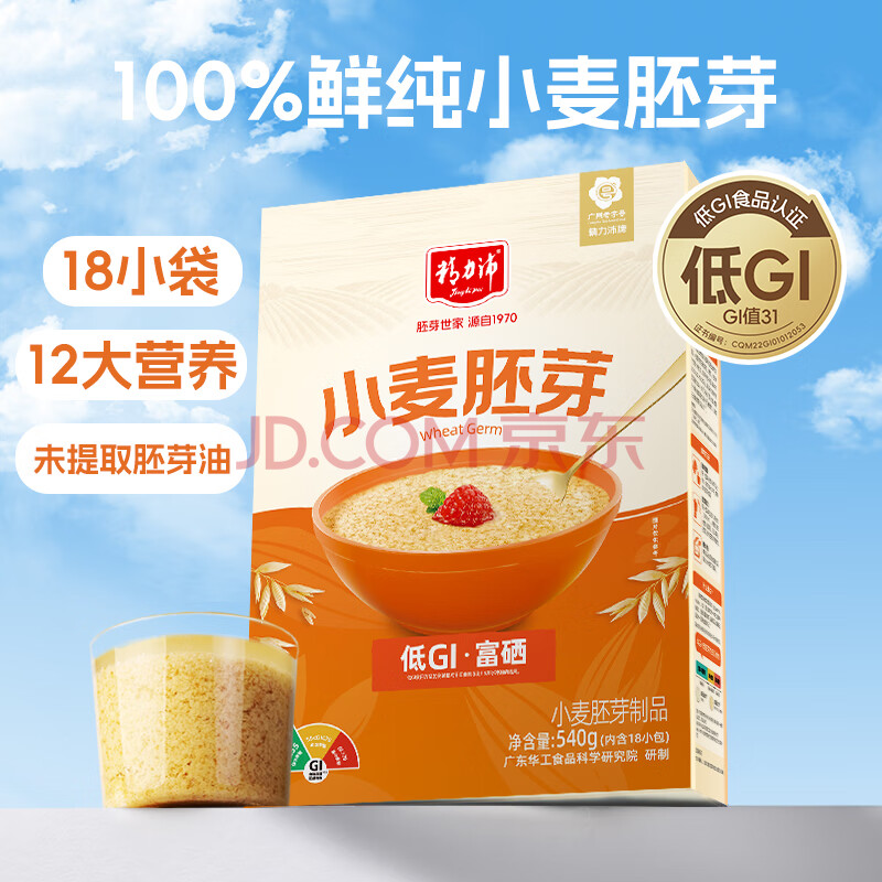 商品相册:精力沛小麦胚芽540g/盒独立包装富硒低GI原味麦片高纤蛋白营养送礼礼品第