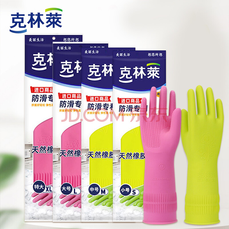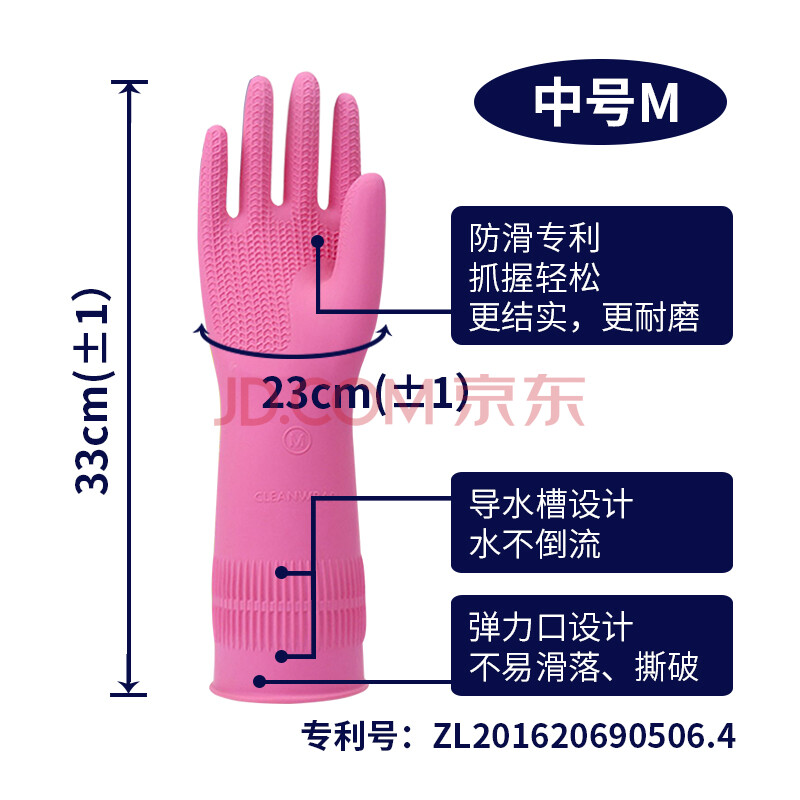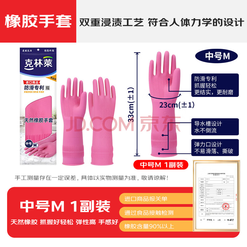 商品相册:克林莱天然橡胶手套M中号红色长款越南进口防滑专利清洁家务厨房食品用第