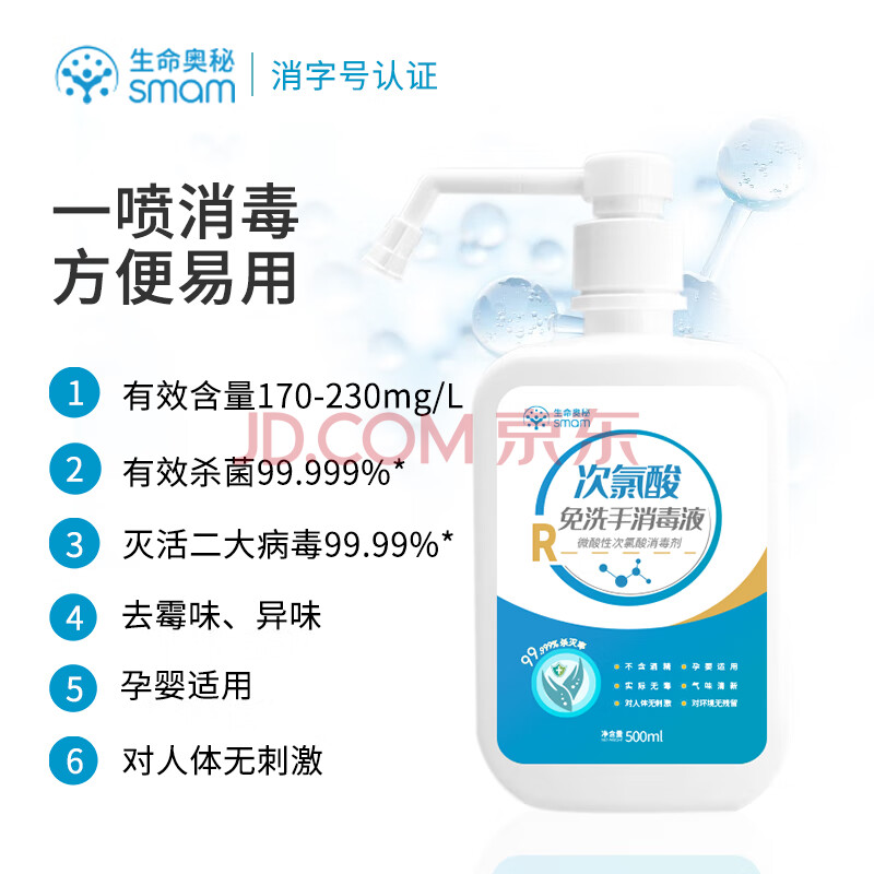 商品相册:生命奥秘次氯酸免洗手消毒液微酸性含氯消毒剂500ml儿童洗手除菌非84酒精第