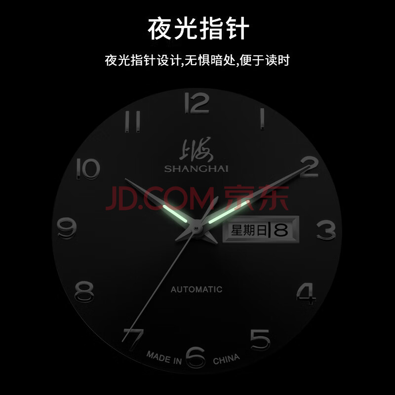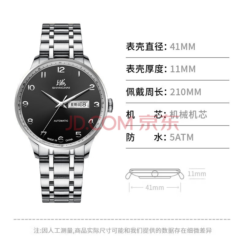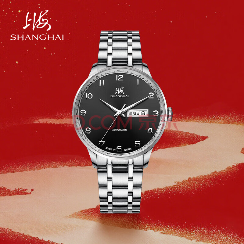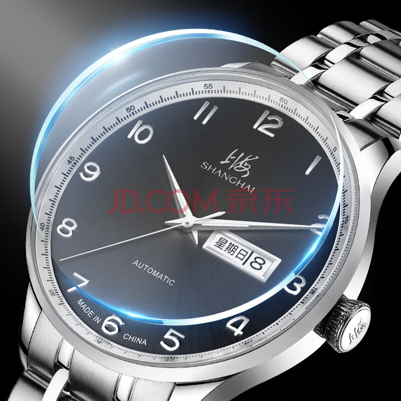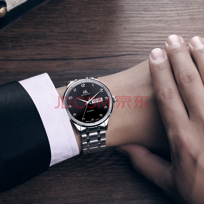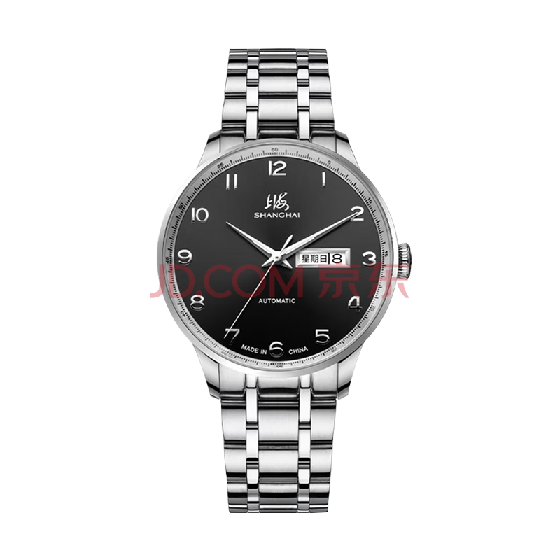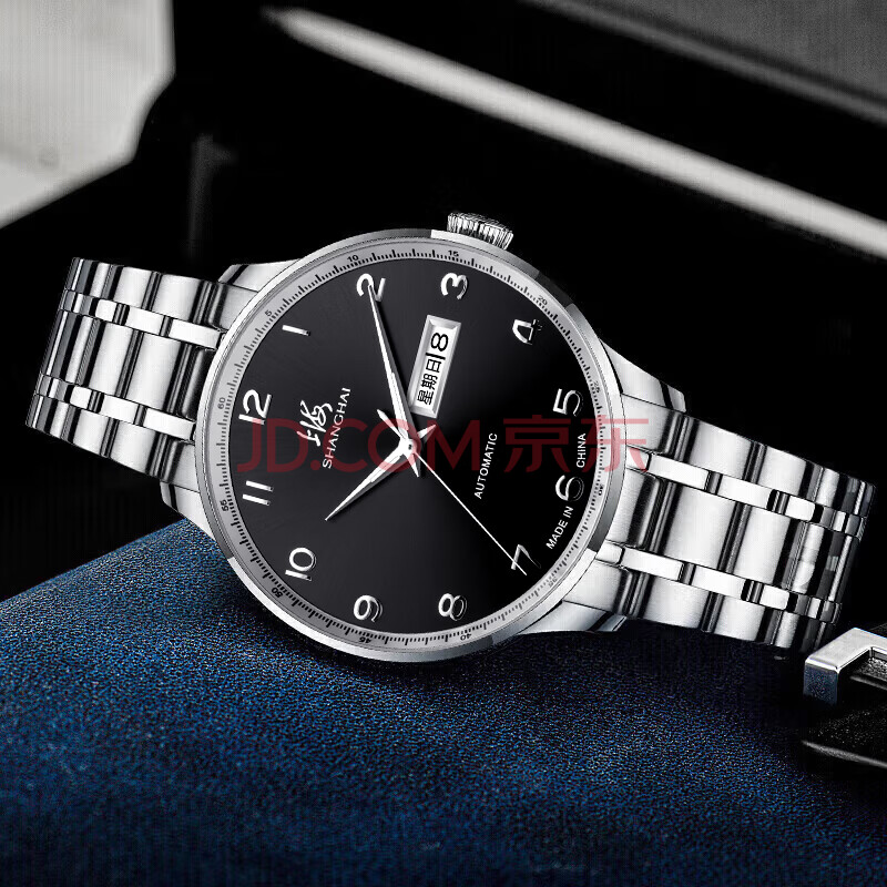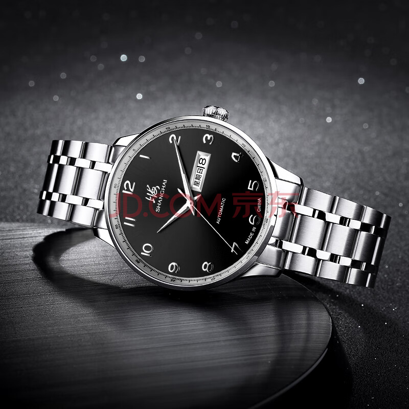 商品相册:上海(SHANGHAI)手表男款 男士自动机械表 国民系列 商务经典 黑盘钢带SH3013NB-1第