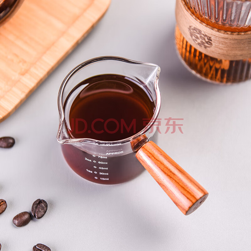 商品相册:CLITON日式木柄玻璃奶盅奶罐耐热量杯拉花杯带刻度奶泡双嘴小奶壶75ml第