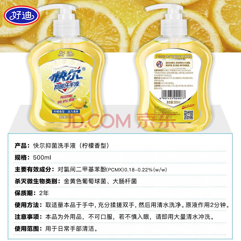 商品相册:好迪抑菌洗手液柠檬香型健康99.9%泡沫丰富清爽易冲洗护手500ml*2瓶第