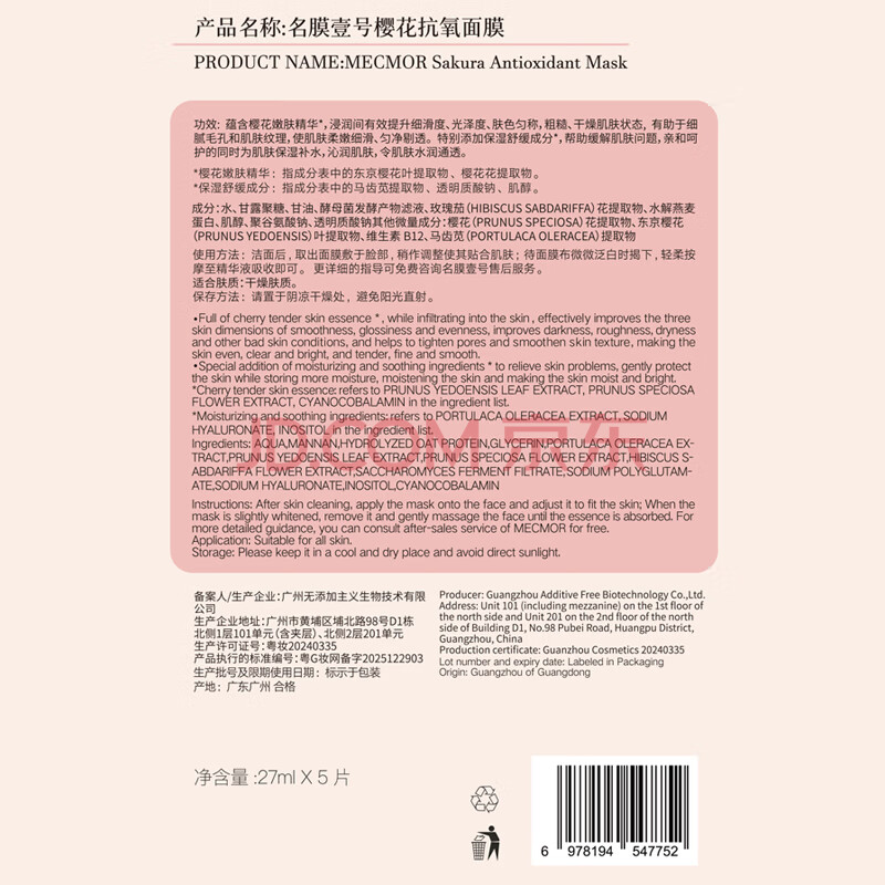 商品相册:名膜壹号(mecmor)樱花面膜粉红精华保湿补水亮肤控油抚平细纹毛孔5片第