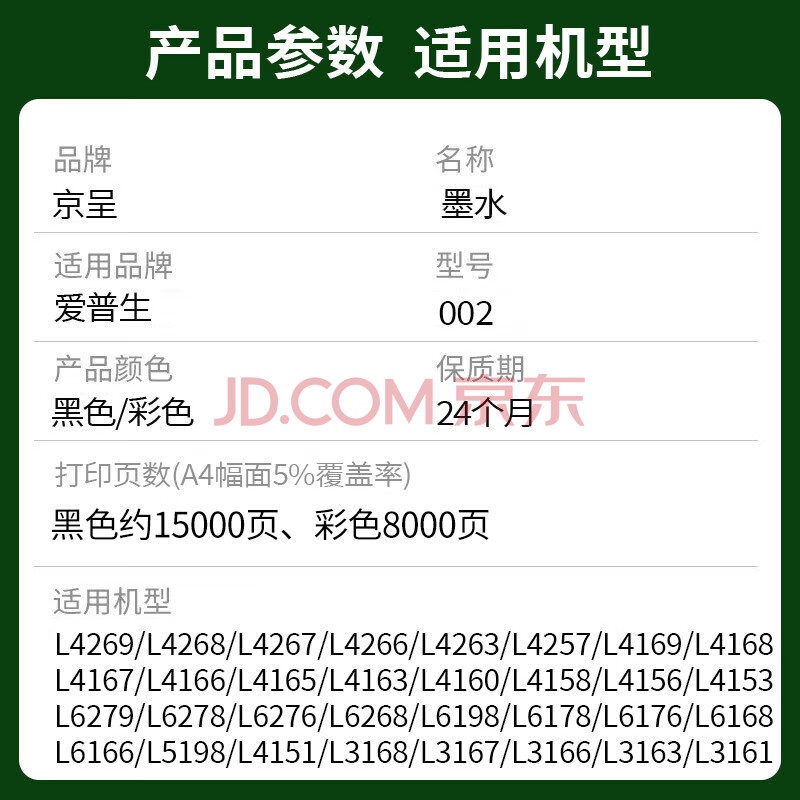 商品相册:京呈适用爱普生002墨水L4266 L4168 L4268 L4166 L4269 4158 4160 4168 4267 6178 epson打印机墨水 四色套装第