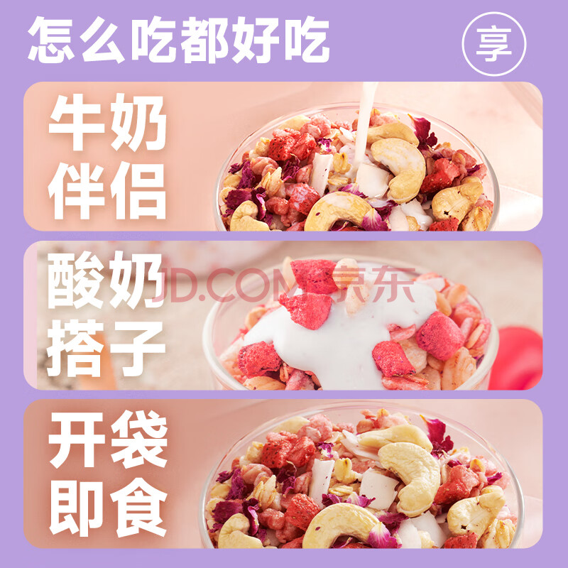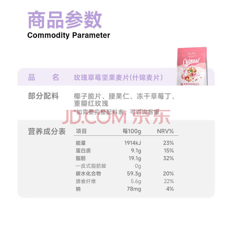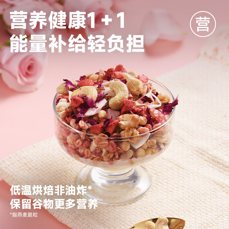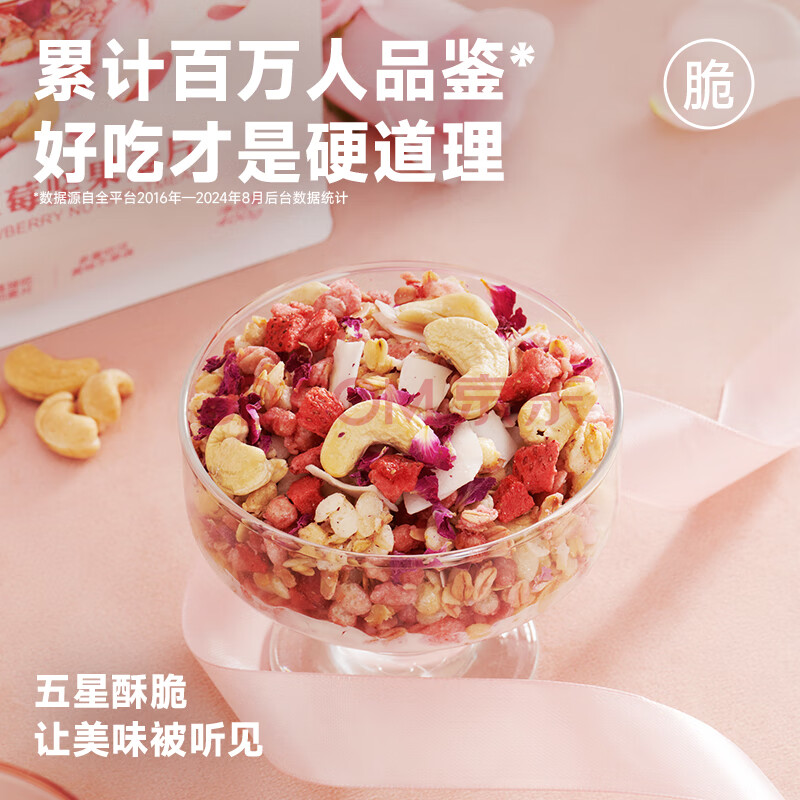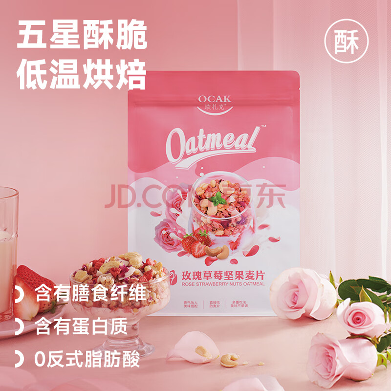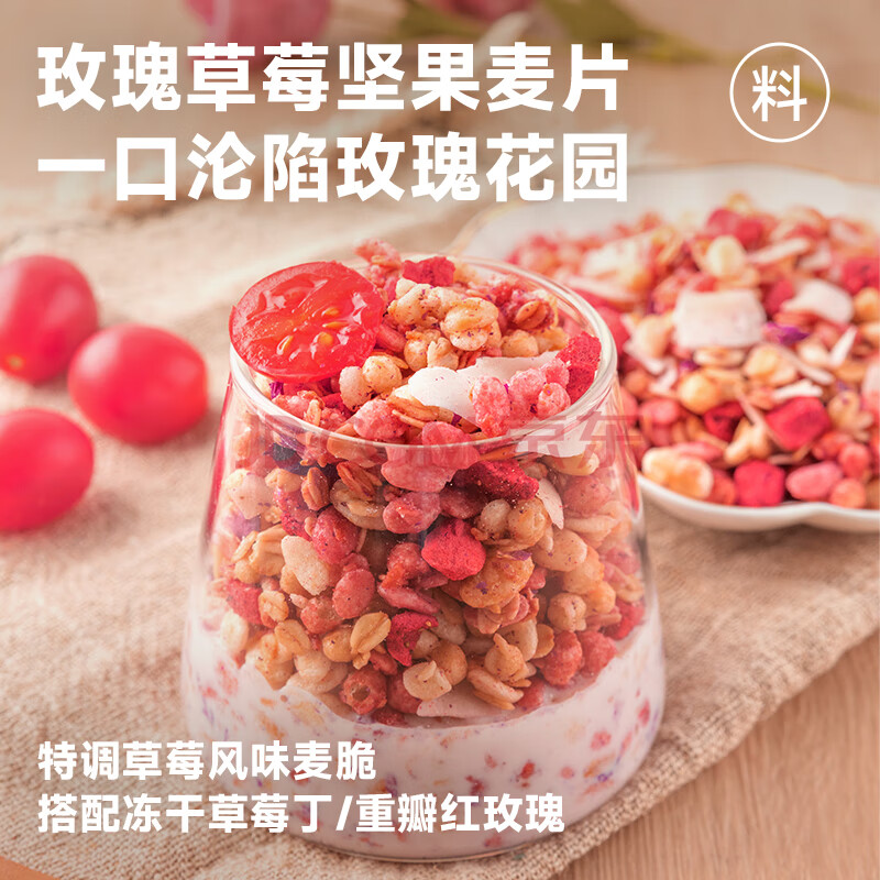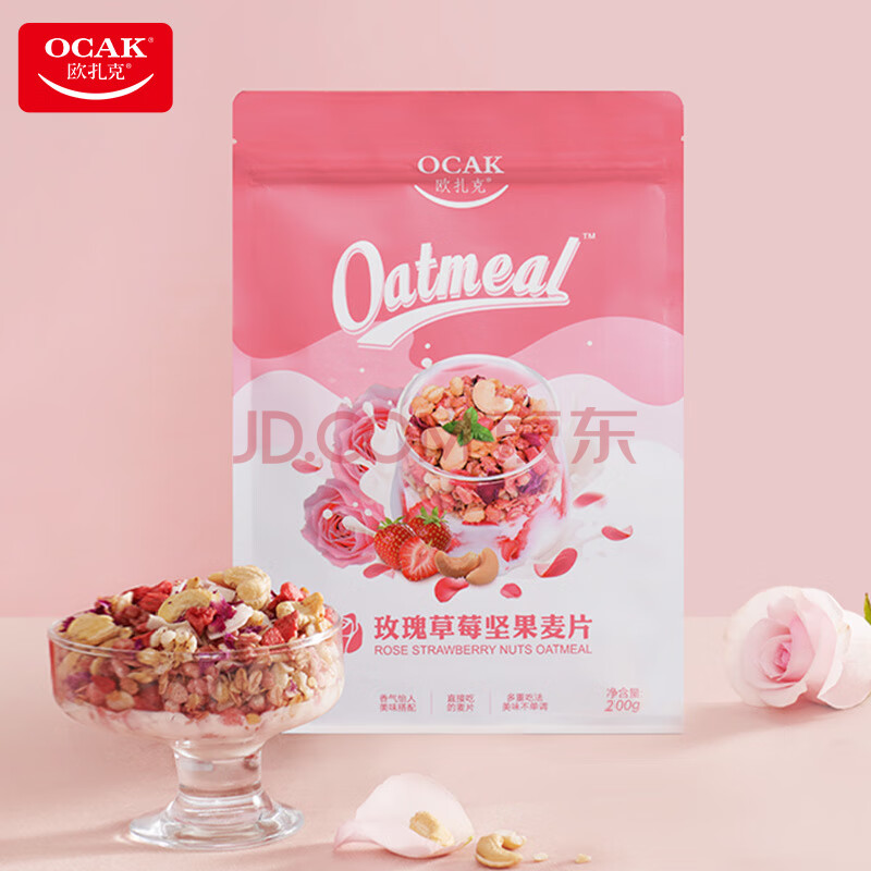 商品相册:欧扎克 麦片营养早餐 即食燕麦片零食代餐冲饮谷物干吃玫瑰草莓味200g第1张/共8
