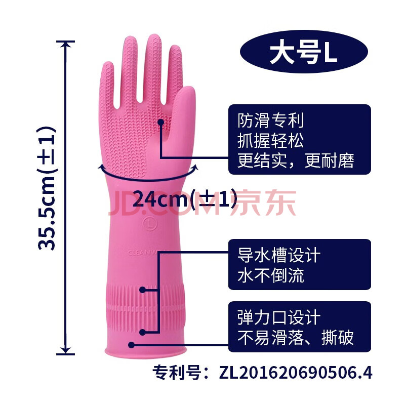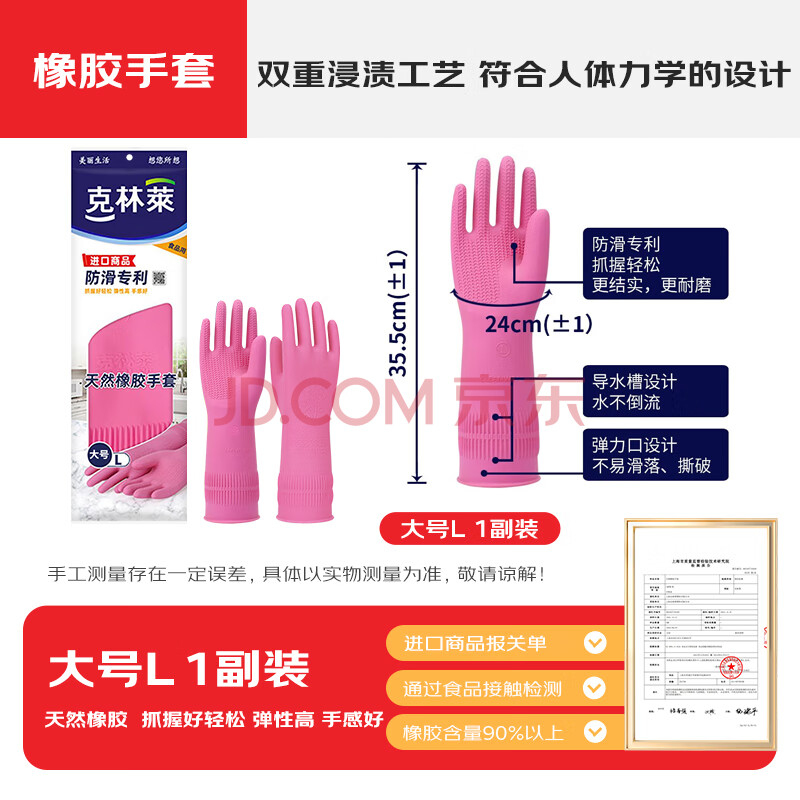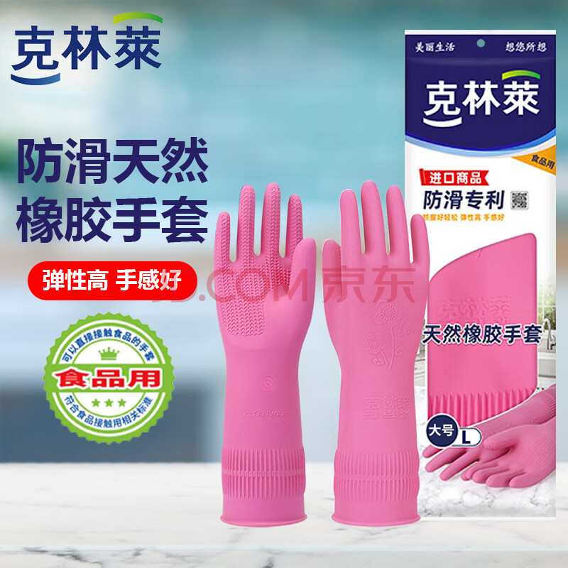 商品相册:克林莱天然橡胶手套L码大号长款越南进口防滑专利清洁洗碗厨房食品用第