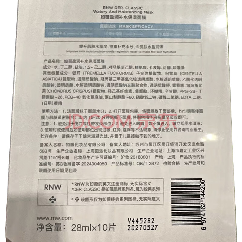商品相册:如薇(RNW)玻尿酸沁漾补水面膜套装30片深层保湿补水熬夜锁水送男女友第