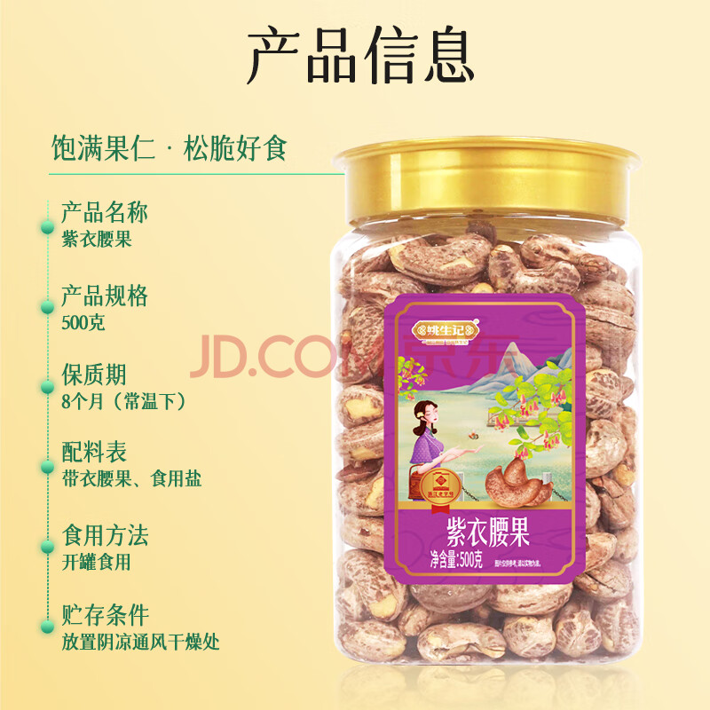 商品相册:姚生记A180大颗粒紫皮腰果仁500g 越南腰果休闲零食 每日坚果炒货干果仁第