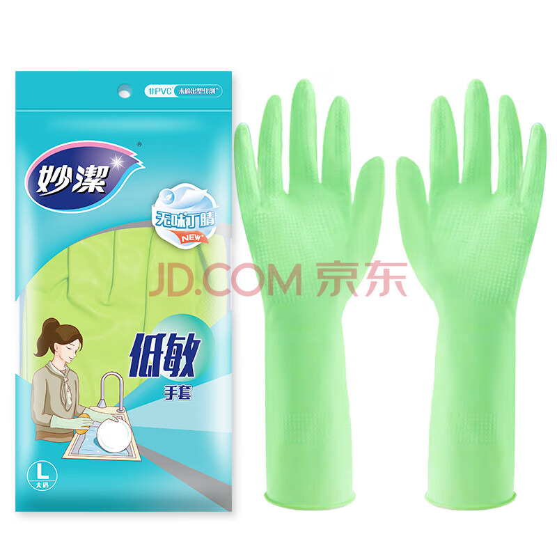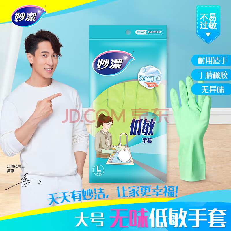 商品相册:妙洁低敏丁腈橡胶手套 1双 大号 无异味 厚皮实耐用防滑家务厨房洗碗第
