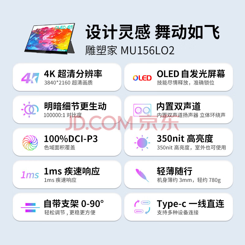 商品相册:雕塑家15.6英寸4K OLED便携式显示器 100%DCI-P3色域 手机电脑笔记本分屏 设计师移动拓展副屏MU156LO2第