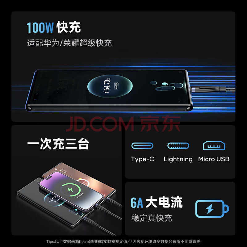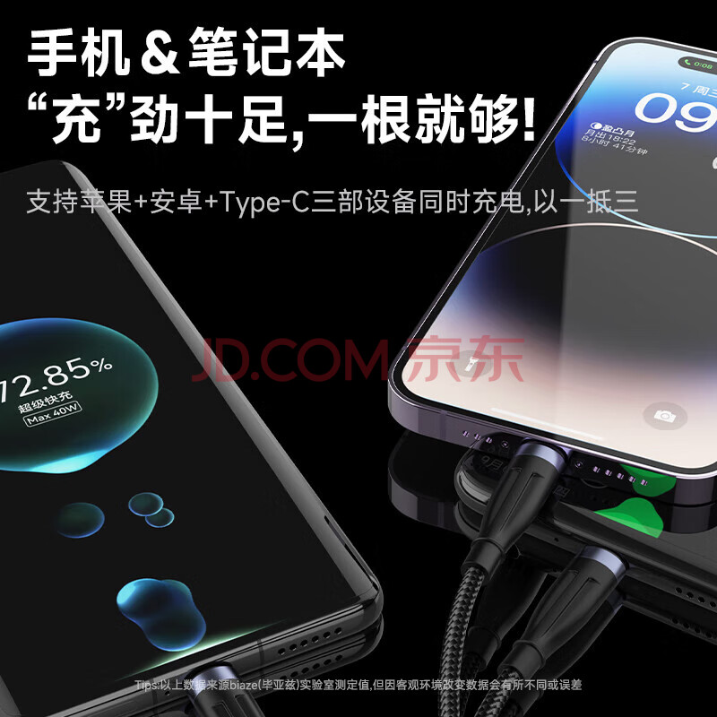 商品相册:毕亚兹适用三合一快充数据线100W/66W一拖三头充电线苹果Type-C安卓iPhone17/16/15/14小米华为手机车载第