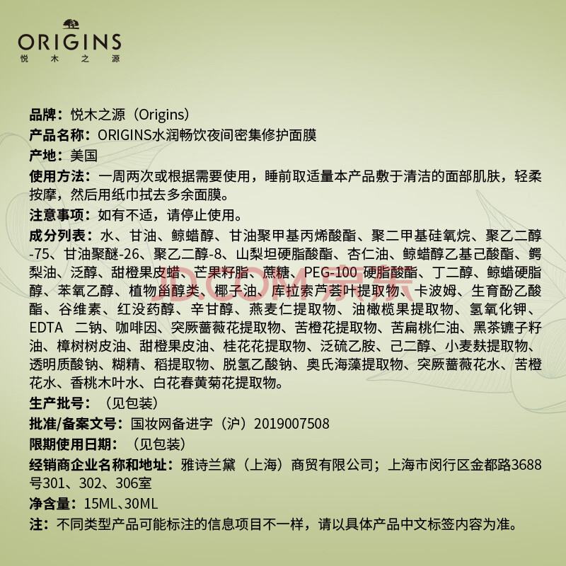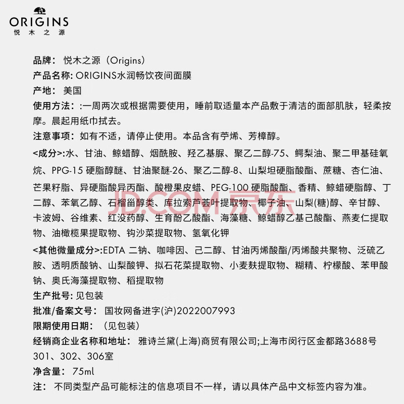 商品相册:悦木之源(Origins)畅饮夜间修护睡眠面膜75ml温和补水保湿面膜护肤品生日礼物送女友第