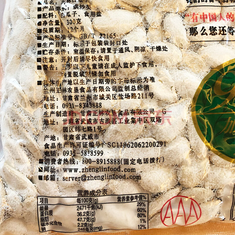 商品相册:正林白瓜子300g/袋原味大片熟南瓜子坚果炒货休闲零食第