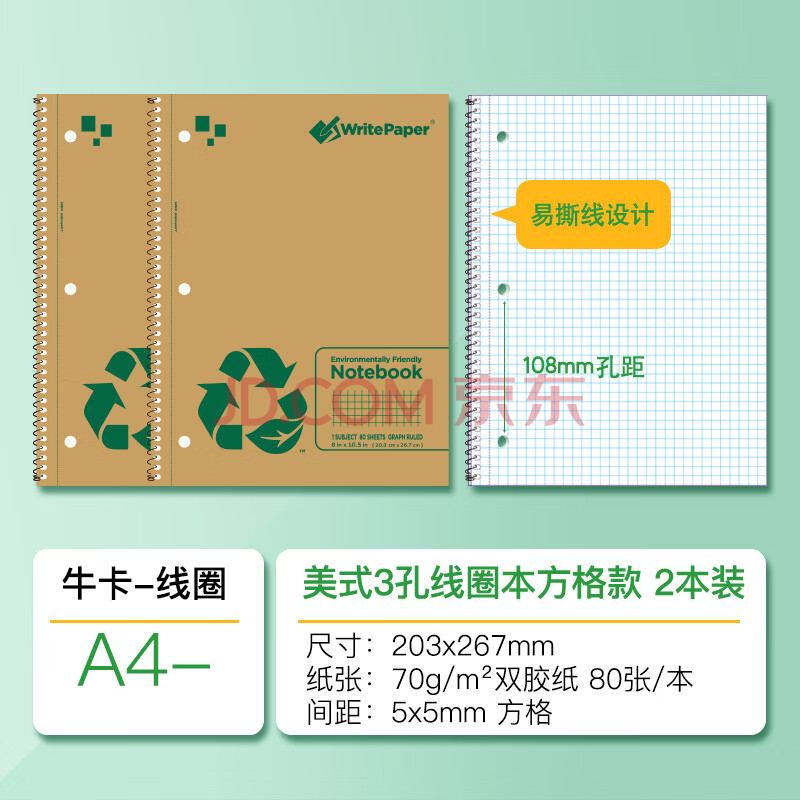 商品相册:凯萨(KAISA)方格笔记本A4-/80张三孔线圈本复古牛皮纸网格本 思维导图记事本2本 (203x267mm)第