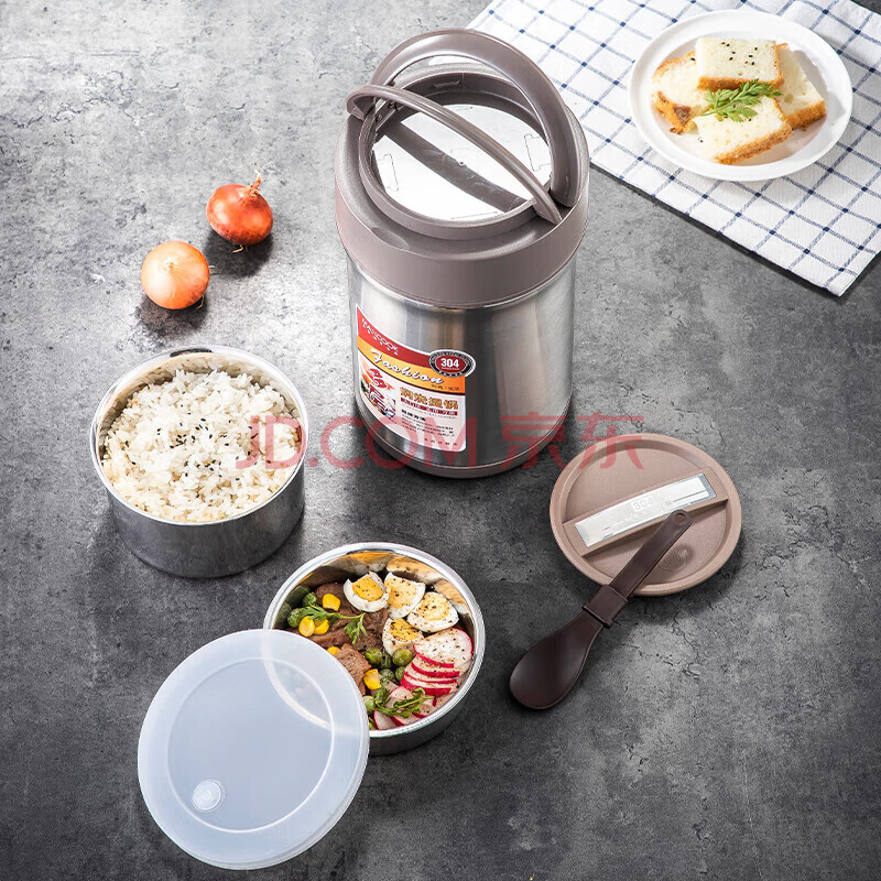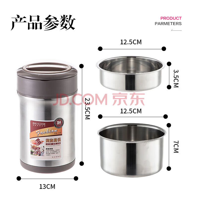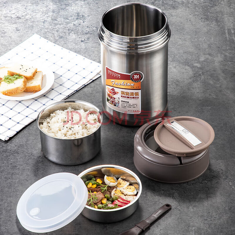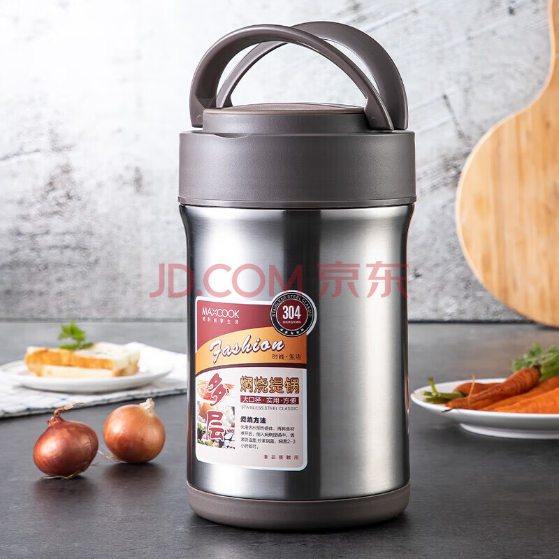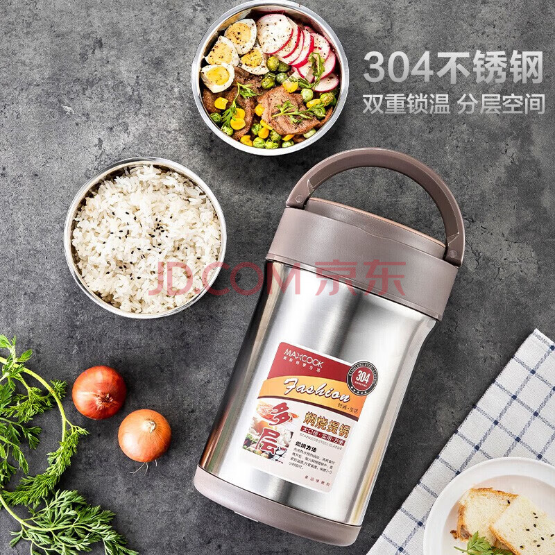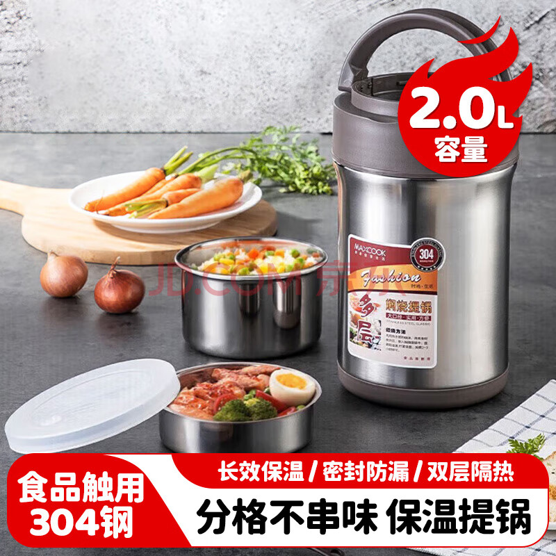 商品相册:美厨(MAXCOOK)304不锈钢保温饭盒 焖烧提锅2L真空防溢保温桶 配餐具本色MCTG986第