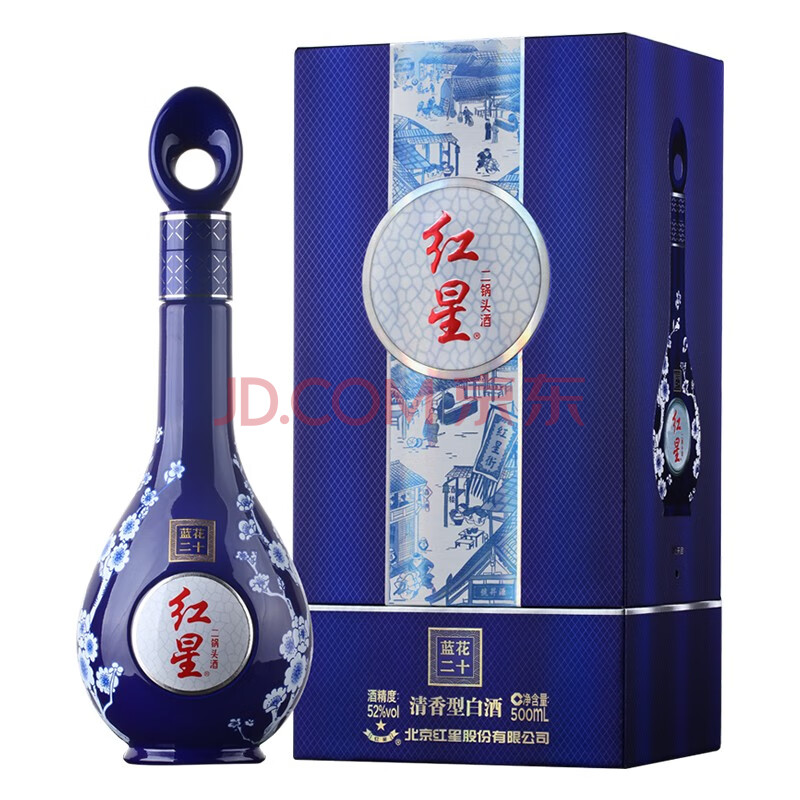 商品相册:红星二锅头 蓝花20 清香型白酒 52度 500ml 单瓶装 纯粮 口粮酒 送礼第