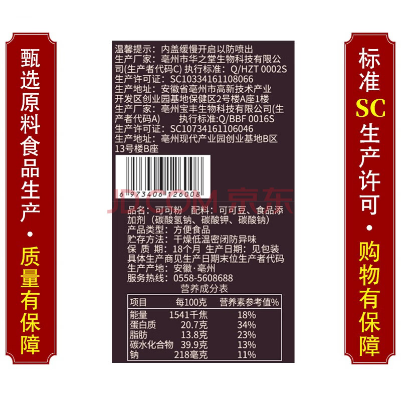 商品相册:宅福艺 可可粉烘培蛋糕奶茶店可用生黑食用碱化热巧克力冲饮原料150g第