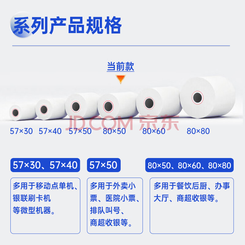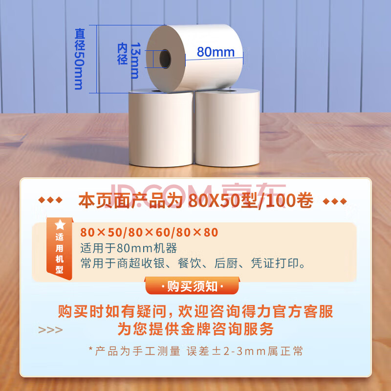 商品相册:得力(deli)(deli)80*50mm20米*100卷 白令海热敏收银纸 京东外卖收银机打印纸 ZS127【适配80mm机器 801P等】第