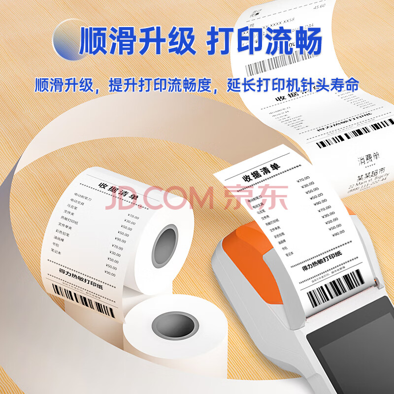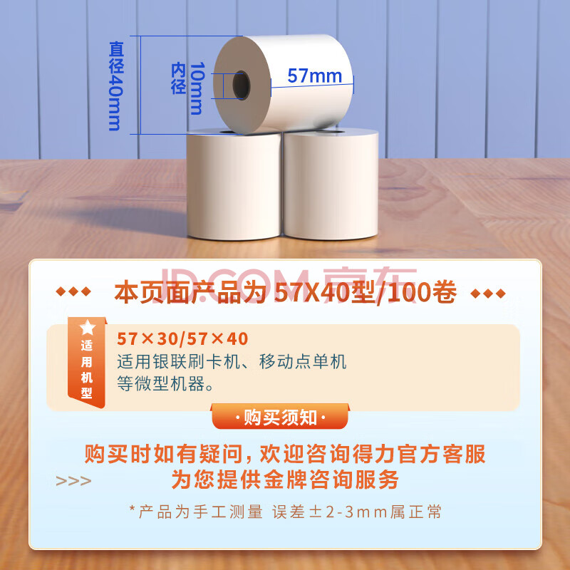 商品相册:得力(deli)57*40mm12米*100卷 白令海热敏超市纸 京东美团外卖超市小票纸 ZS121【适配58mm机器 5801P等】第