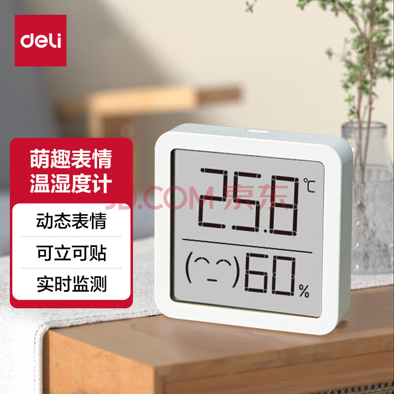 商品相册:得力(deli)微笑温湿度计 家用室内电子温度计表 动态表情 可立可墙贴 8845第