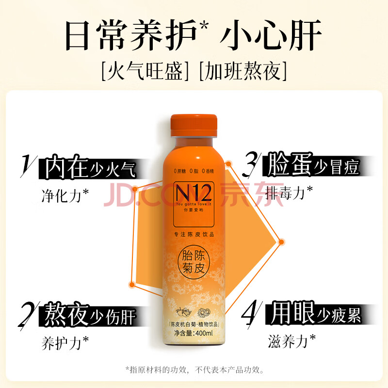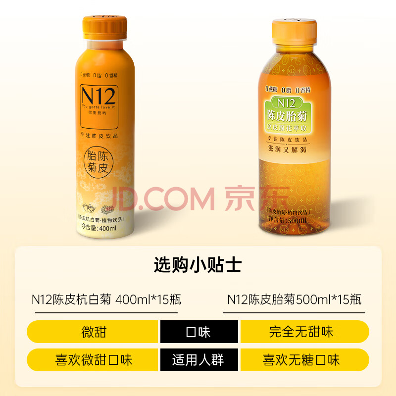 商品相册:N12陈皮菊花茶0糖0脂低卡清健康火气无糖茶植物饮料400ml15瓶整箱装第