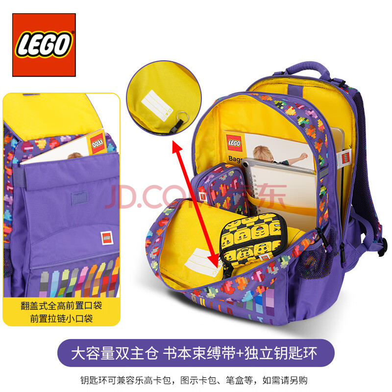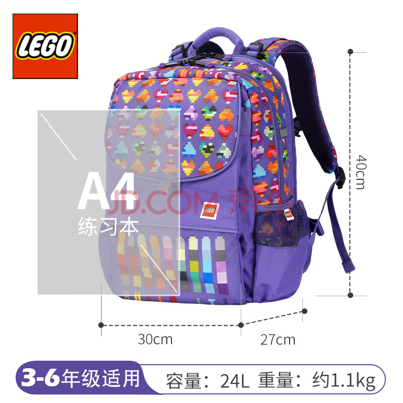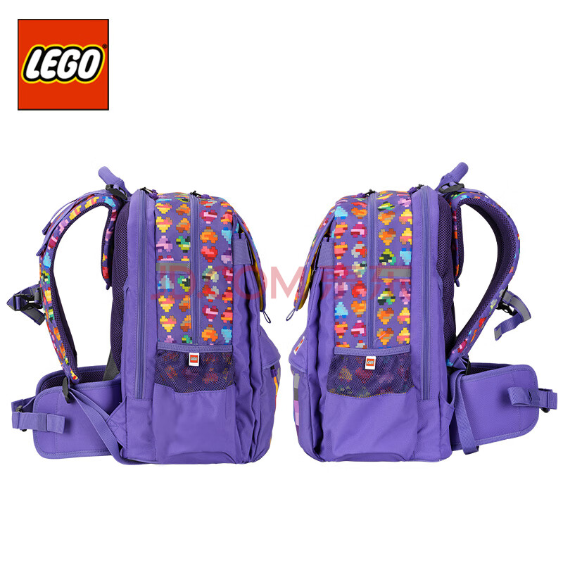 商品相册:乐高(LEGO)书包学生女3-6年级双肩包轻背包大容量可调肩带护脊减负粉紫20192第