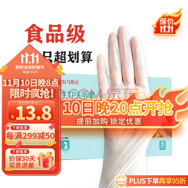 商品相册:乌斯京 一次性TPE手套200只中码食品级餐饮厨房美容塑料薄膜手套第