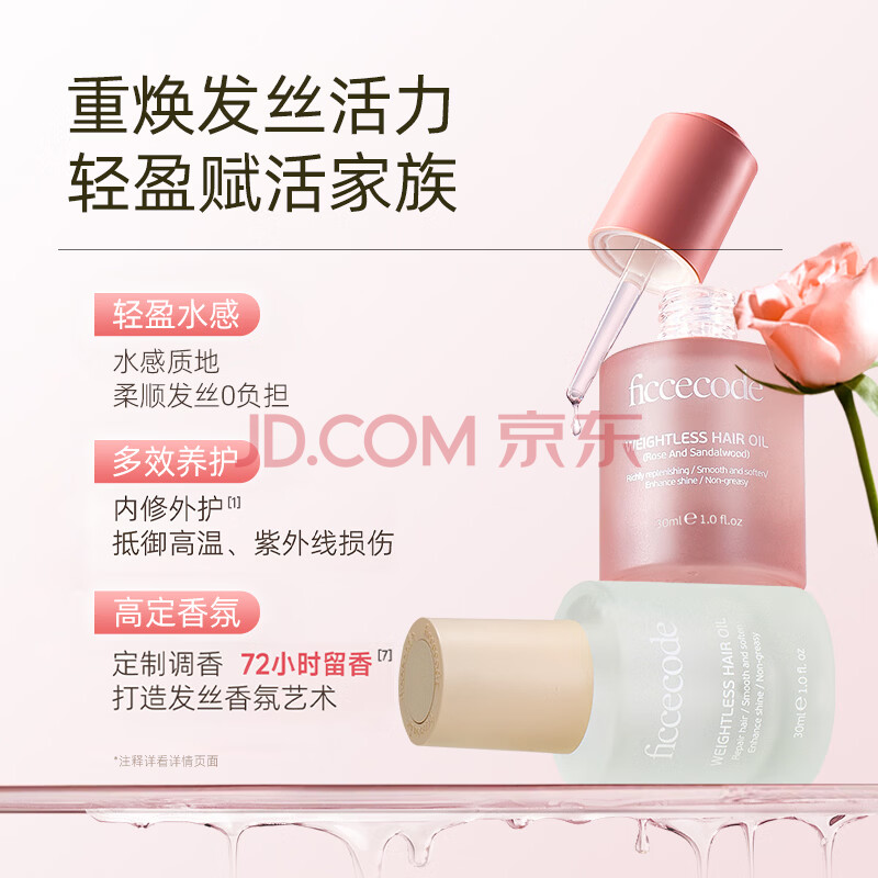 商品相册:菲诗蔻(Ficcecode)护发精油若光瓶30ml玫瑰新香轻盈赋活免洗柔顺改善毛躁修护干枯第