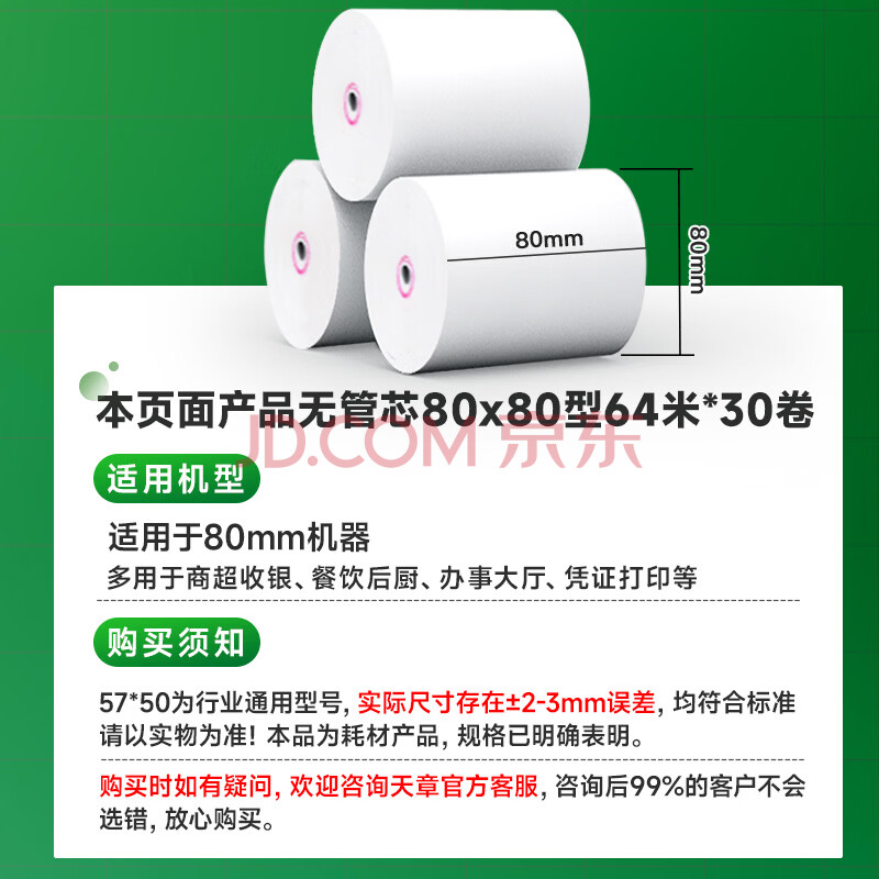 商品相册:天章 (TANGO)80*80mm64米*30卷 新绿天章热敏收银纸 京东外卖餐饮后厨小票纸 银行影院凭证打印纸【无管芯】第