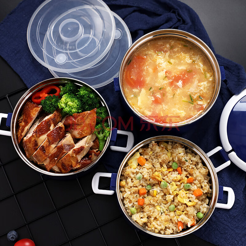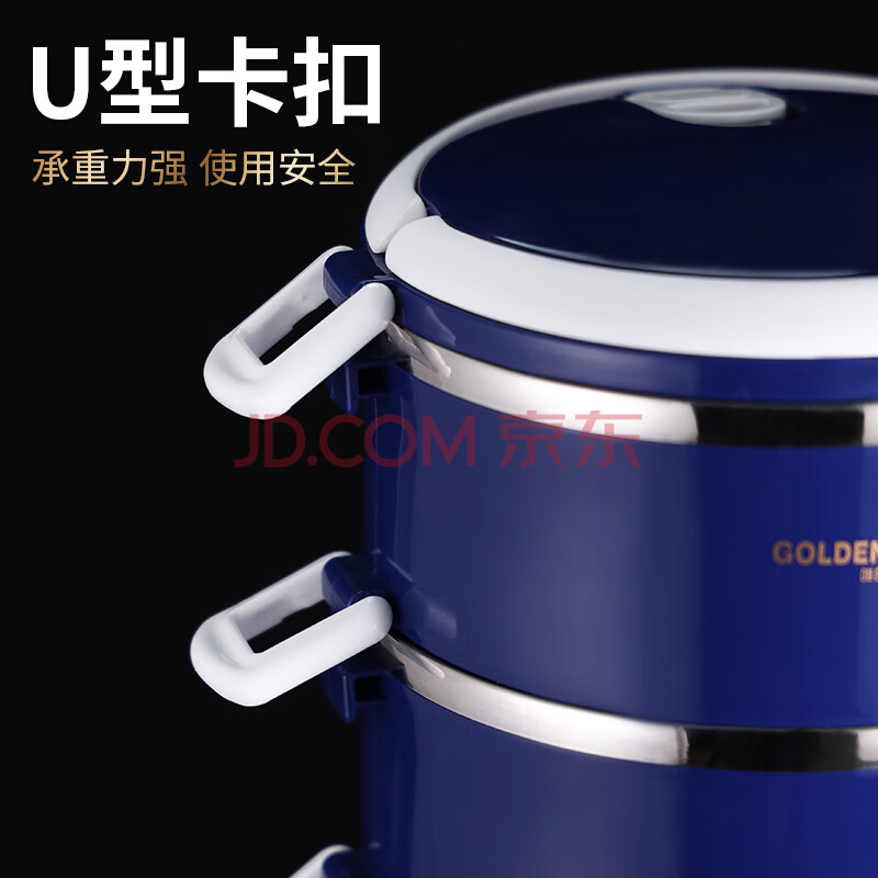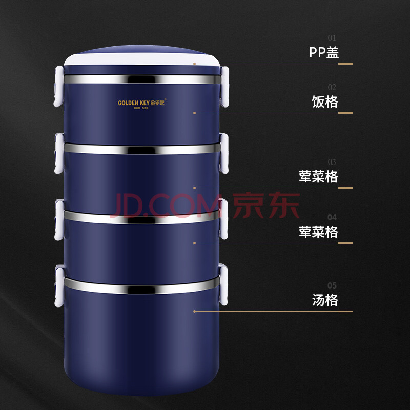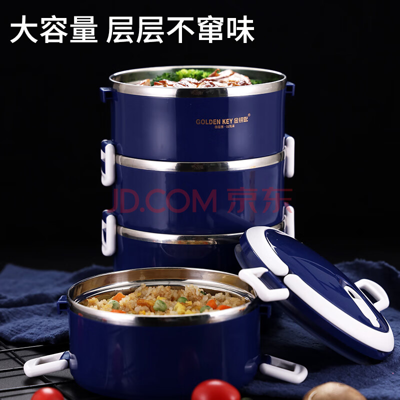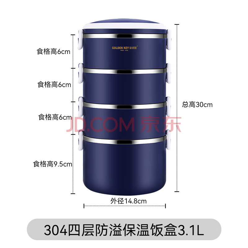 商品相册:金钥匙304不锈钢四层防溢保温饭盒多层组合便当盒3.1L尊贵蓝GK-3100BD-L第1张/共6
